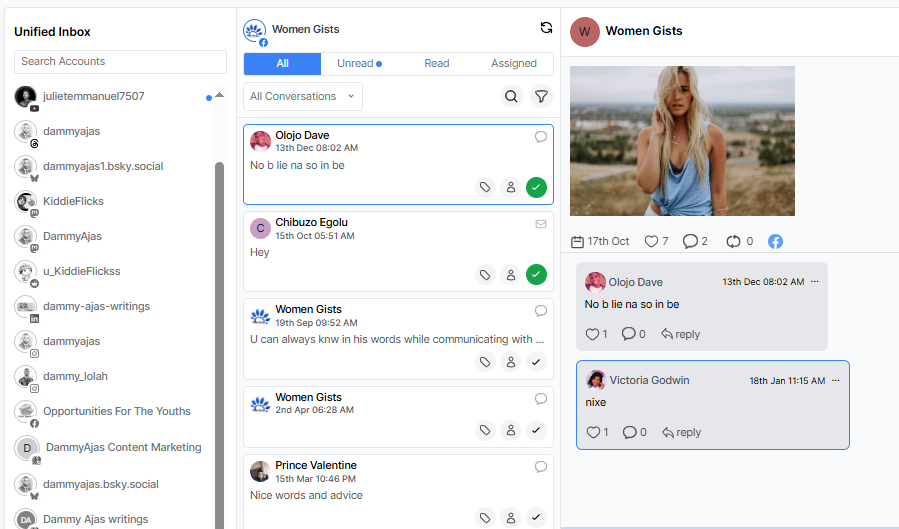 This cross-platform integration means you can reply to a Facebook comment, check an Instagram DM, and schedule a LinkedIn post – all from the same dashboard.