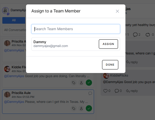 You can also add internal notes to share context (“followed up on @[email protected] yesterday; waiting on order number”) without posting publicly. And if priorities change, you can easily reassign with one click.