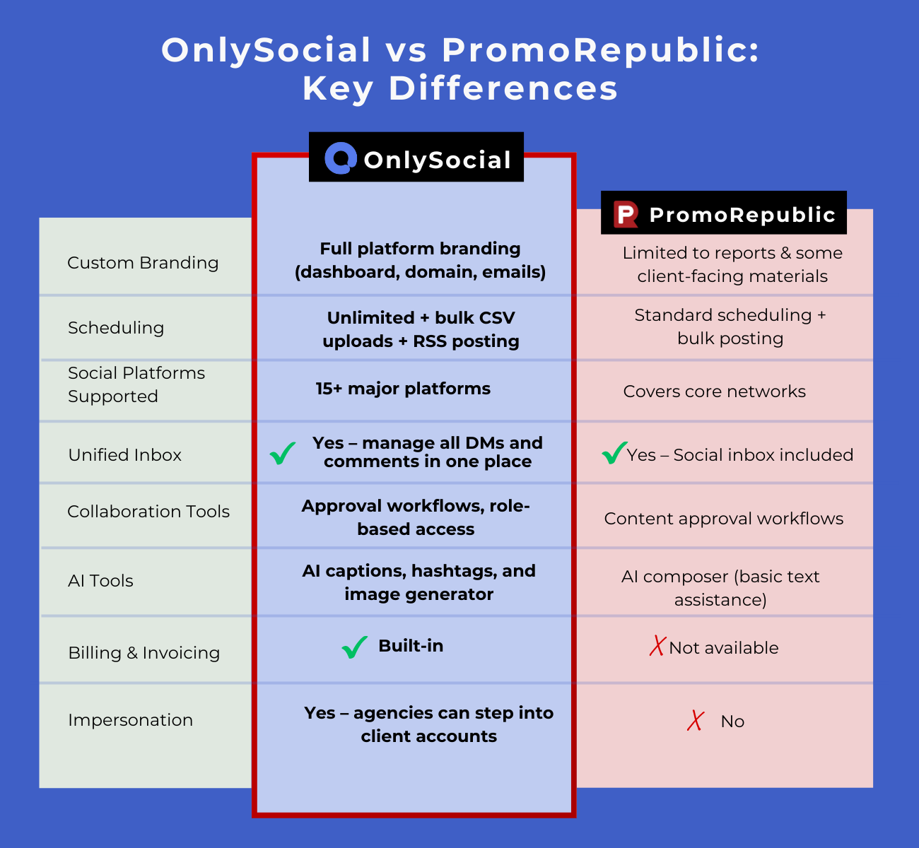 OnlySocial is better for scaling because of its unlimited scheduling, affordable tiered pricing, and built-in billing features. PromoRepublic is more suited to local agencies focused on reputation management.