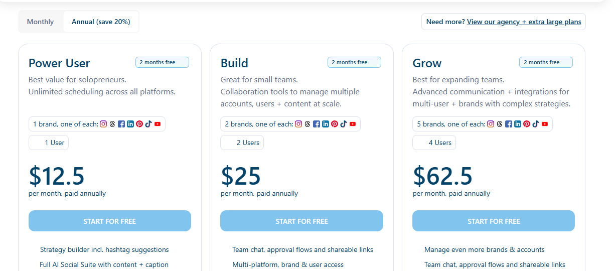 Agorapulse starts at $99/month, but the advanced features are locked behind higher-tier plans, which can get expensive. For small businesses, the price might be a stretch. But for agencies, the mix of scheduling, inbox, and reporting tools makes it a strong investment.