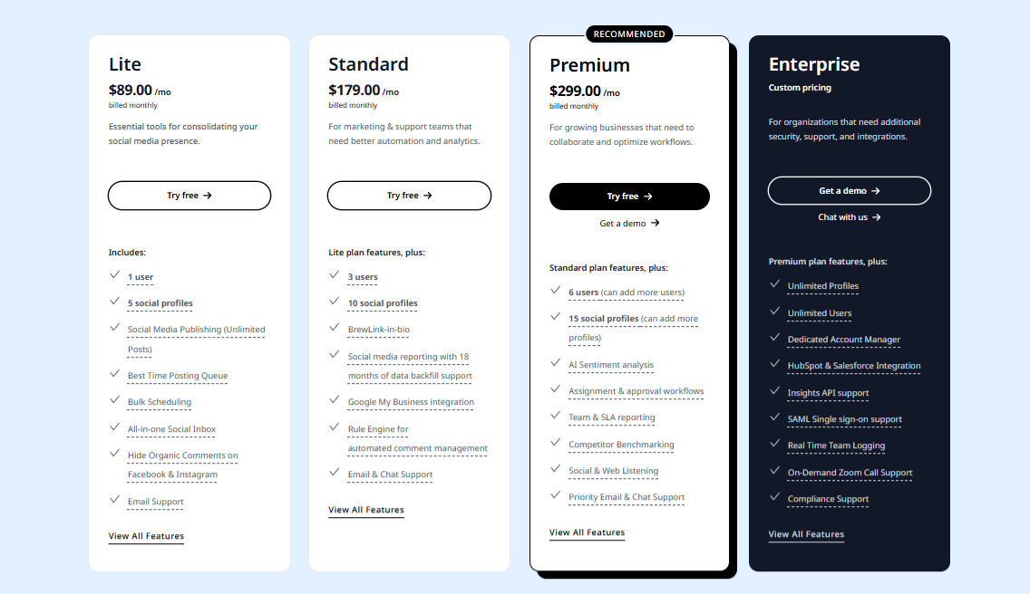 Let’s be honest, Statusbrew isn’t exactly wallet-friendly. Starting at $89/month for one user and five profiles, it feels more suited to enterprise-level teams than small businesses or freelancers. If you’re managing just a few accounts, it can feel like paying for features you’ll never use.
